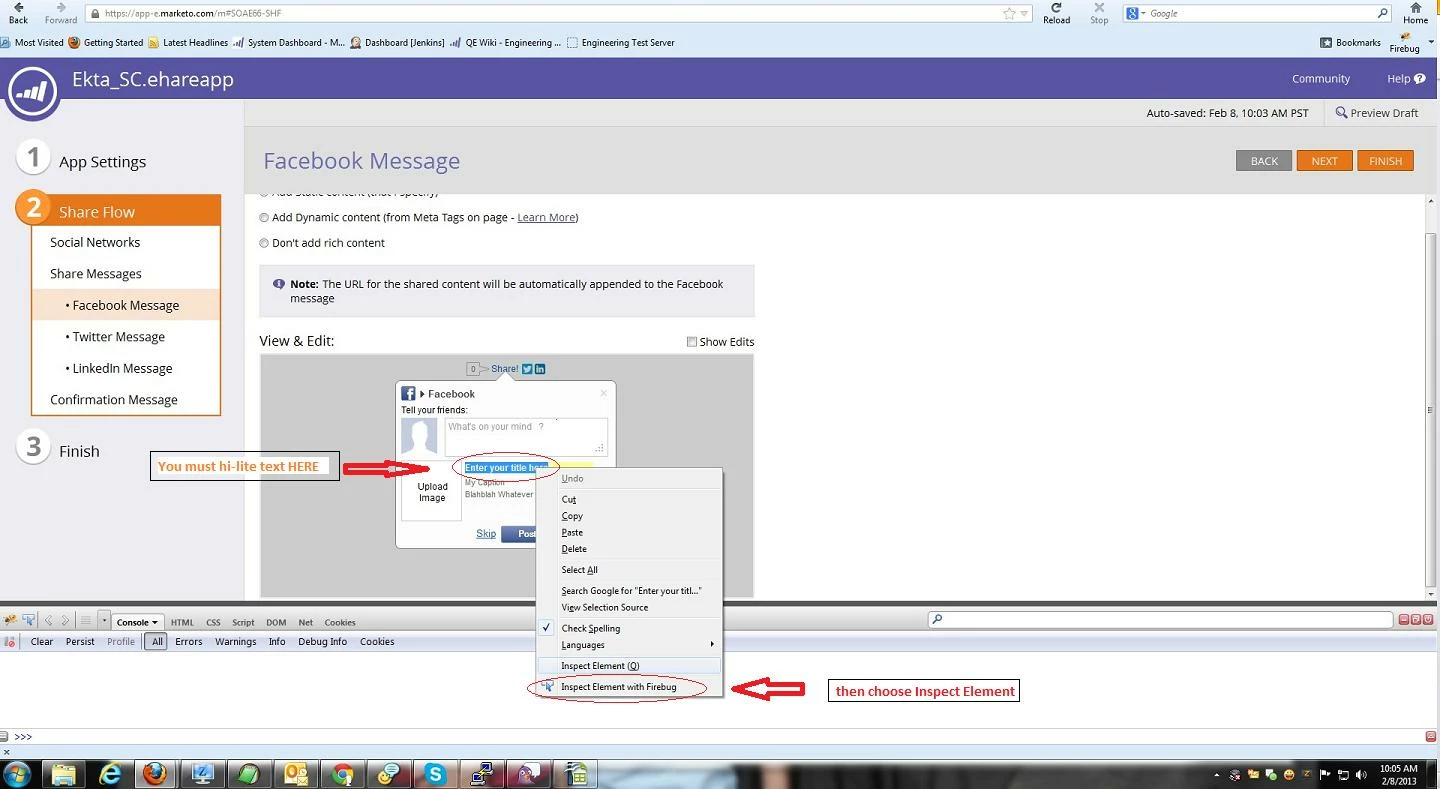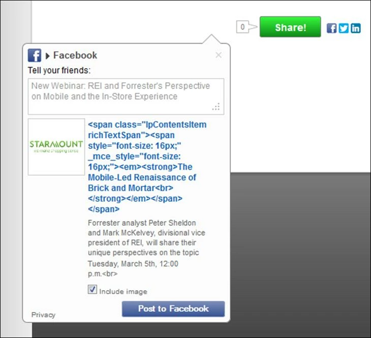 Have just been able to start playing with the new Social Buttons tonight... I think I've got it all sorted out however: when I use the "Add static content (that I specify)" option, save it, place the button on a test landing page, and click on the FB button, everything looks decent except for the blue title (see below)... obviously the coding is appearing, along with the title itself.