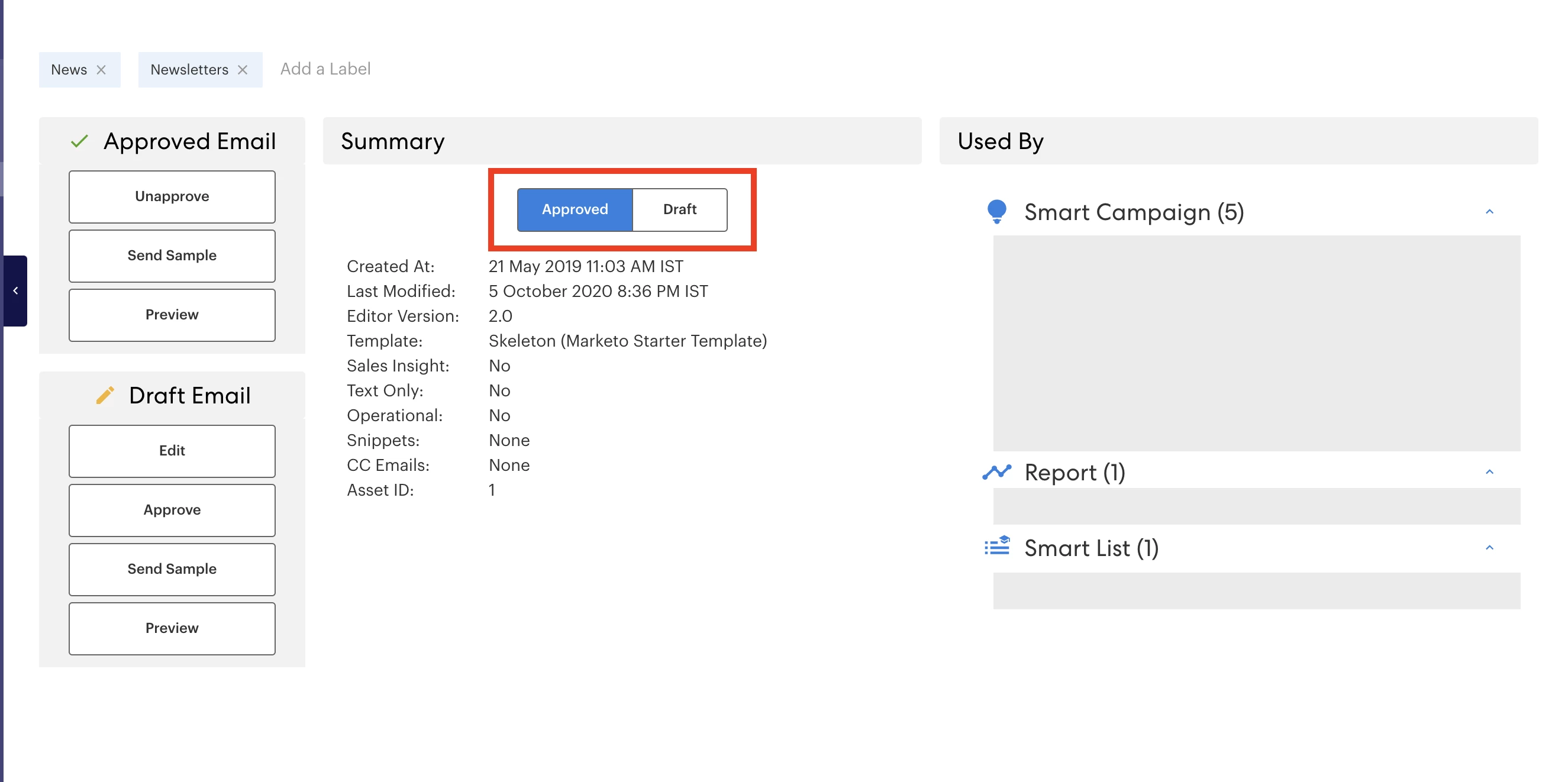 As you’re probably aware, today in Marketo Engage for an asset in the Approved with Draft status, we display two line items (nodes) for assets in the tree: