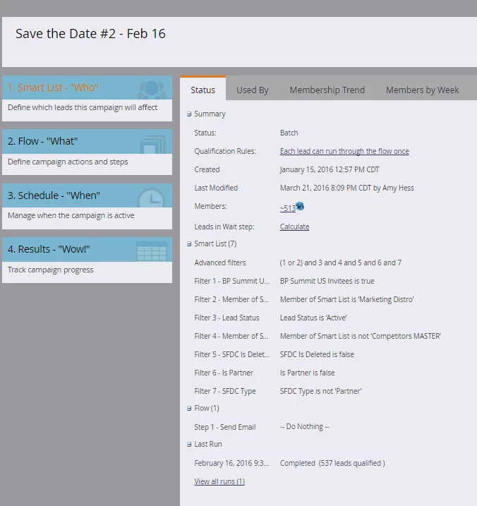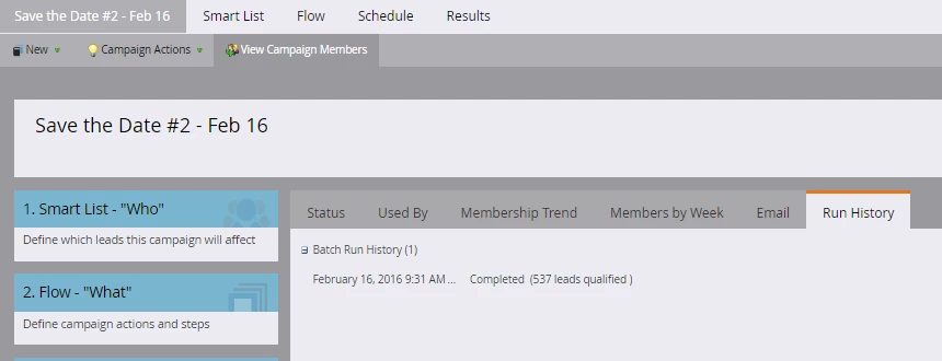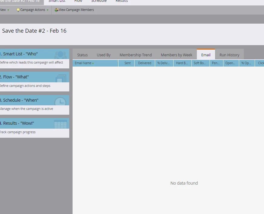 When pulling the email performance report, I noticed that one of the save-the-date emails was not listed, even though I have the entire program selected. I looked at the smart campaign that was used to send that specific email, and I can see that it ran to 537 leads on February 16, 2016. I can also see that someone changed the smart campaign afterwards on March 21, 2016, and now there are no metrics for the smart campaign. I can't see any data in the email, results or email performance reports (see screenshots).