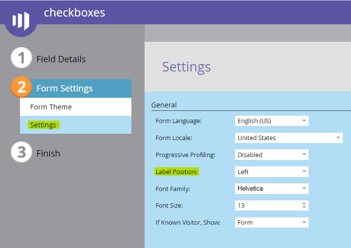 As you can see in the screenshot above, both the checkbox field (top) and the checkboxes field (bottom) have a label (green) to the left of the input. The location of this label is determined by the form settings choice for Label Position on page 2 - it defaults to "left" and can be changed to "above" (see below).