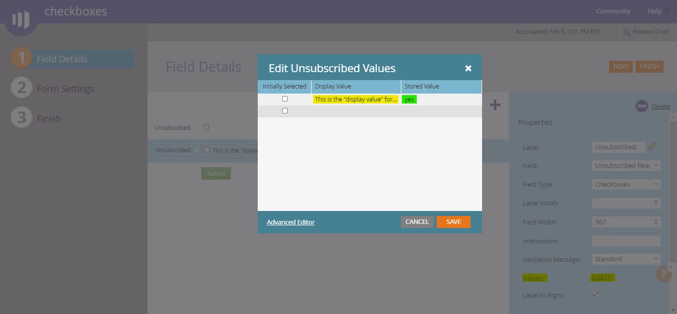 When using the checkboxes field type, you'll get an option added into the blue right column of the editor labeled Values:. Clicking on the "Edit(1)" option will open a dialog window to edit the field values (see below).