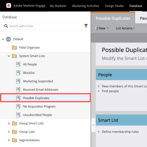 - Locate the System Smart Lists folder, and select the list called Possible Duplicates. (Note: You can also build your own Smart List if you wish to use custom logic.)