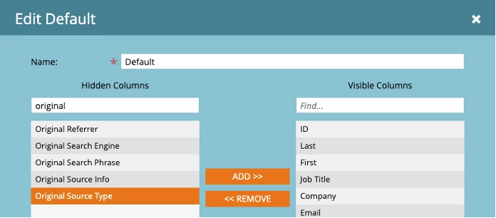 - The data we want to examine is stored in the record’s Original Source Type field. Original Source Type is a system-managed field that stores the location a person or website visitor was first discovered (Example: List Import, Web Page Visit). If this field is not visible as part of the Default view, be sure to add it by choosing Edit Default from the top left dropdown.