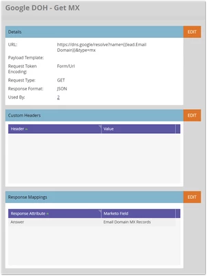 [3] DoH uses the binary DNS wire protocol, not JSON (i.e. the response is a binary stream, like when you download an image). So technically, you’re not sending a DoH request from Marketo; rather, Google is using DoH and transforming the response to be webhook-compatible.
