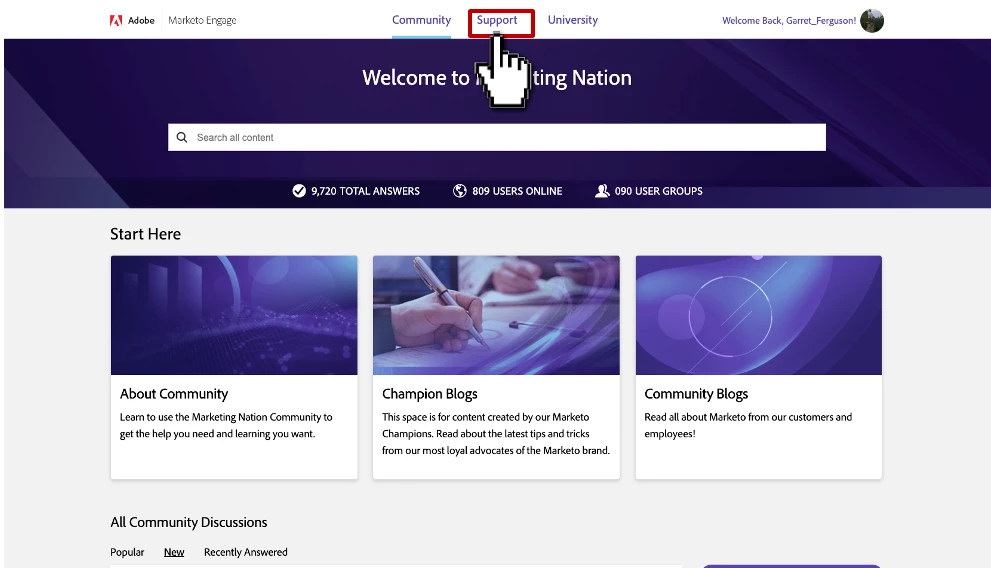 - Inicie sesión en la Comunidad de Marketo y haga clic en Soporte técnico.