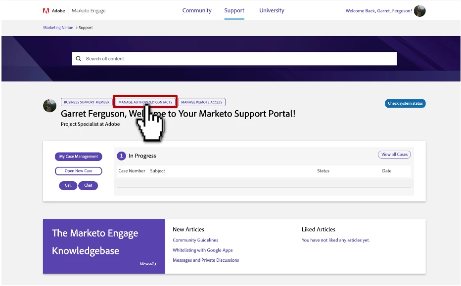 Esto lo llevará a la página de Comunidad (https://nation.marketo.com/), donde pueden completar la configuración de su perfil. Este botón Comunidad también es la forma por la que llegará al portal de soporte técnico para crear casos si es un contacto de soporte técnico autorizado.