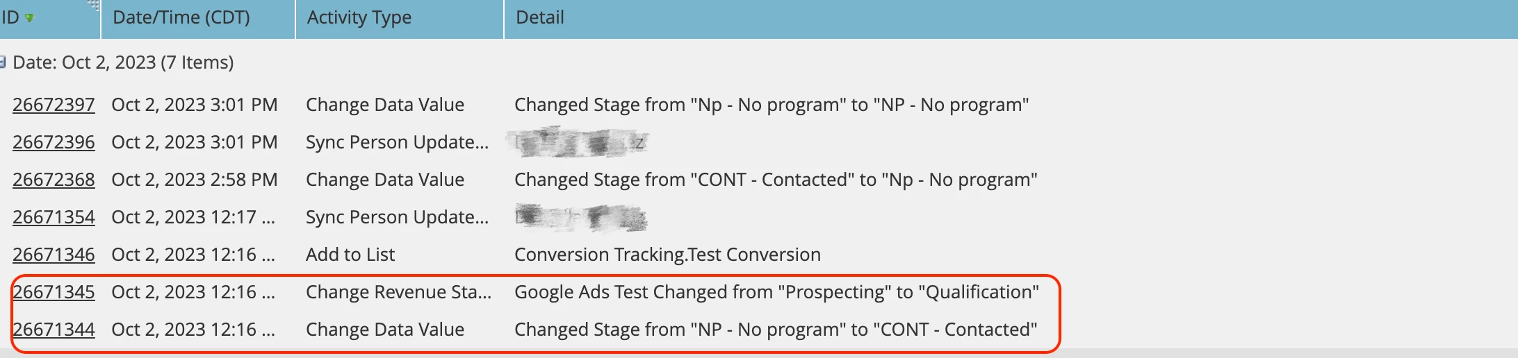 Test Record Example (nothing was showing up in Google Ads after the revenue stage changed)
