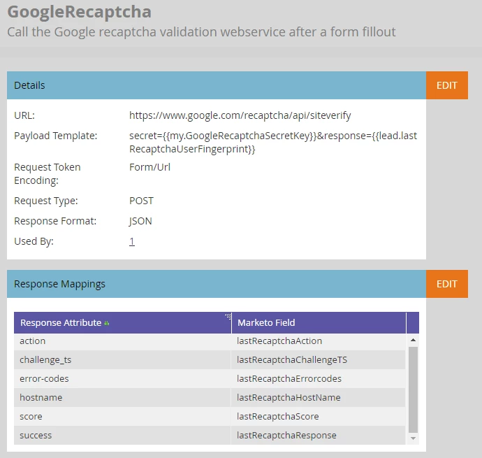 We've implemented tokens for the site key and secret key and created JavaScript to create the fingerprint for Google ReCaptcha. A webhook has been created to leverage the fingerprint and secret key. (see screenshot below)