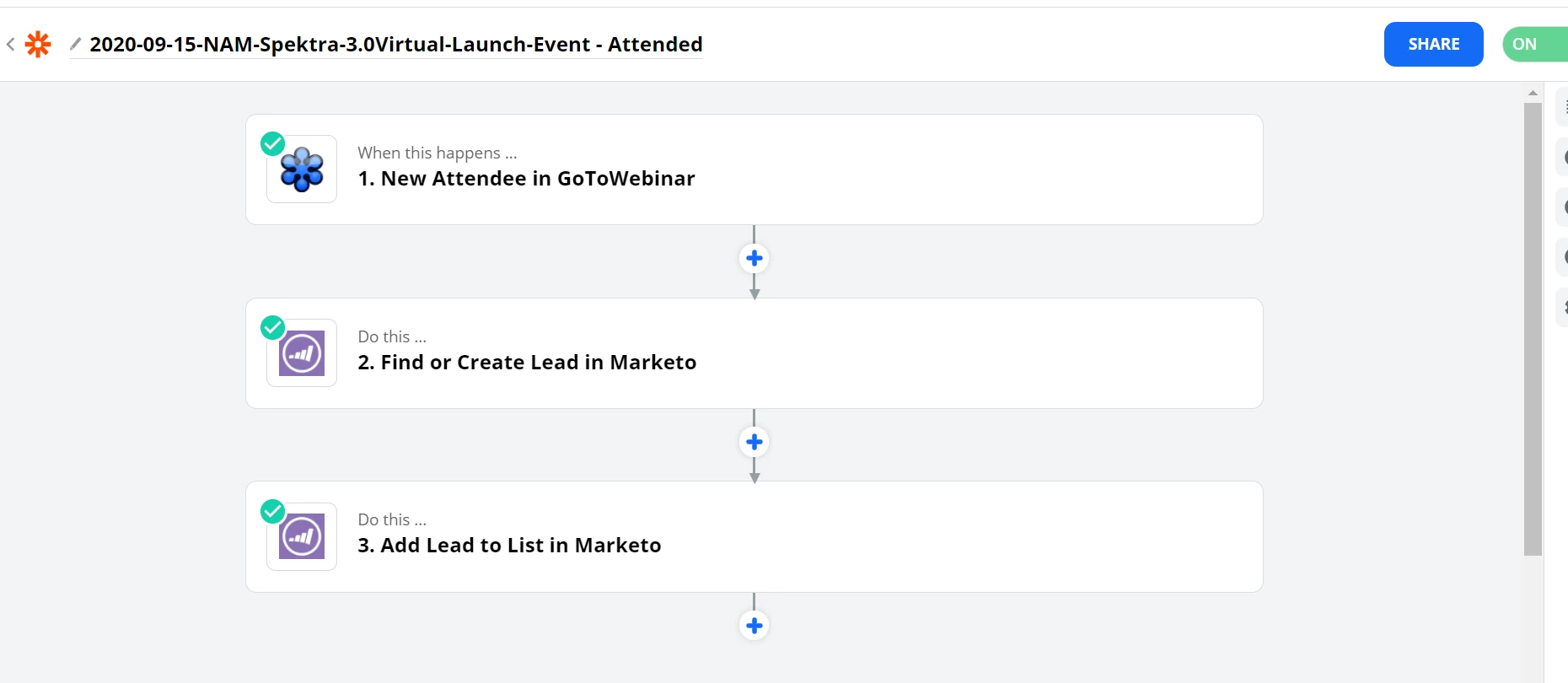 Looking for help on how to automatically pull GoToWebinar simulive webinar attendees from Zapier into Marketo (since the current GTW/Marketo integration only works for live events). I already set it up for pushing from Marketo --> Zapier --> GoToWebinar via webhook and I saw there are a lot of community posts on this, but now I'm trying to do the reverse and pull attendees back into Marketo after the webinar has ended and I haven't been able to find any articles for this. I tried creating a zap that looks like this:
