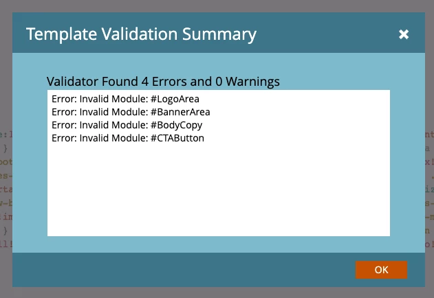 Hoping someone can help me figure out why I'm getting validation errors when trying to add modules to an email template. I uploaded html to Marketo to create a new email template, and then followed the directions in their documentation (Email Template Syntax - Marketo Docs - Product Documentation ) to make the template sections modular.