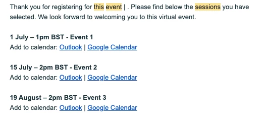 Our issue is that we do not want our users to receive individual emails with calendar ICS files for each single session (there's 6 they can choose from and they can select multiple). Ideally, our users would receive one single email when they register that contains (not sure if this would have to be a zip file) an ICS calendar file for all the sessions they registered for. I hope this makes sense, and thanks in advance for any help -- it's much appreciated!