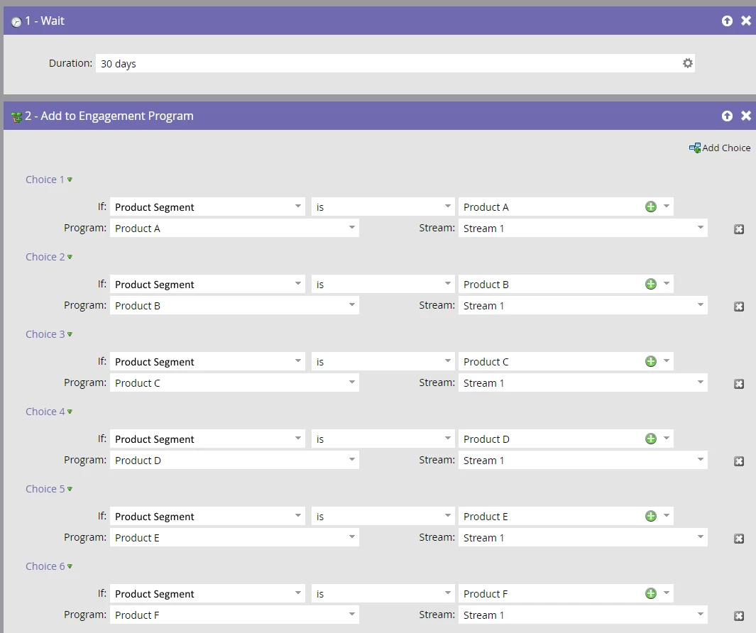 The Keys are 1. Program Re-Entry (or Loop) every 30 days after subscribing to a product (successful upsell conversion) and 2. Dynamic Segmentation to ensure they receive the version of the email that applies to them. Obviously this would require an exit condition or transition for when the Data Value Change does in fact convert from Product 1 Subscribed = FALSE to Product 1 Subscribed = TRUE. *These are boolean custom fields I created since I'm dealing with a custom CRM where custom objects cannot be used in Segmentation.