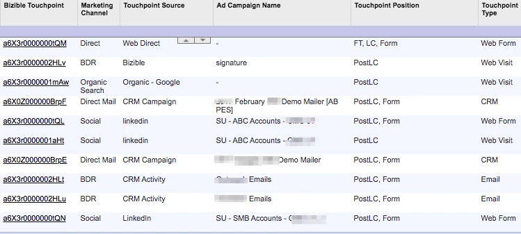 For example, in the following screenshot, you can see there are varying values for columns such as Touchpoint Source, Ad Campaign Name and Touchpoint Type: