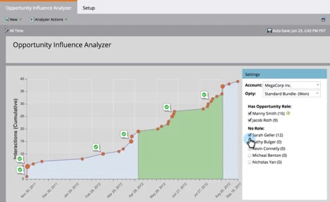 For any opportunity, Marketo will show the story of how that opportunity was influenced by marketing. The little red dots above are clickable, and are comprised of interesting moments and program successes.