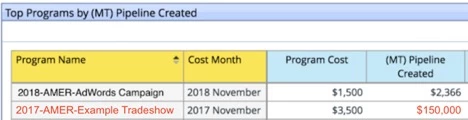 Now that we know how multi-touch is calculated, we can pull pipeline reports per program. Perhaps we want to know how much (MT) pipeline is associated with the tradeshow. In this case, Revenue Explorer will credit the $100,000 from Jane and the $50,000 from John for a total of $150k in pipeline from the show.