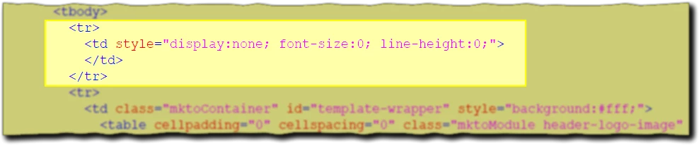 So we set to clipping things out of the email to see if we could make it stop. We removed all Microsoft-specific stuff (conditional comments, etc.). Cut out webfonts on a (poor) hunch. Removed line breaks from attributes: another bad guess. Nothing helped until we cut out this totally innocent-looking <tr>: