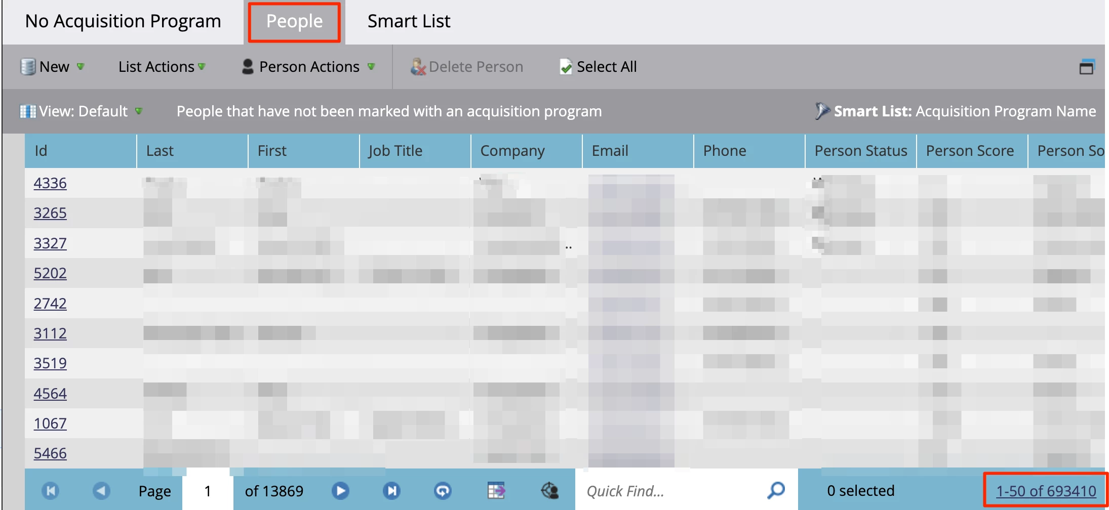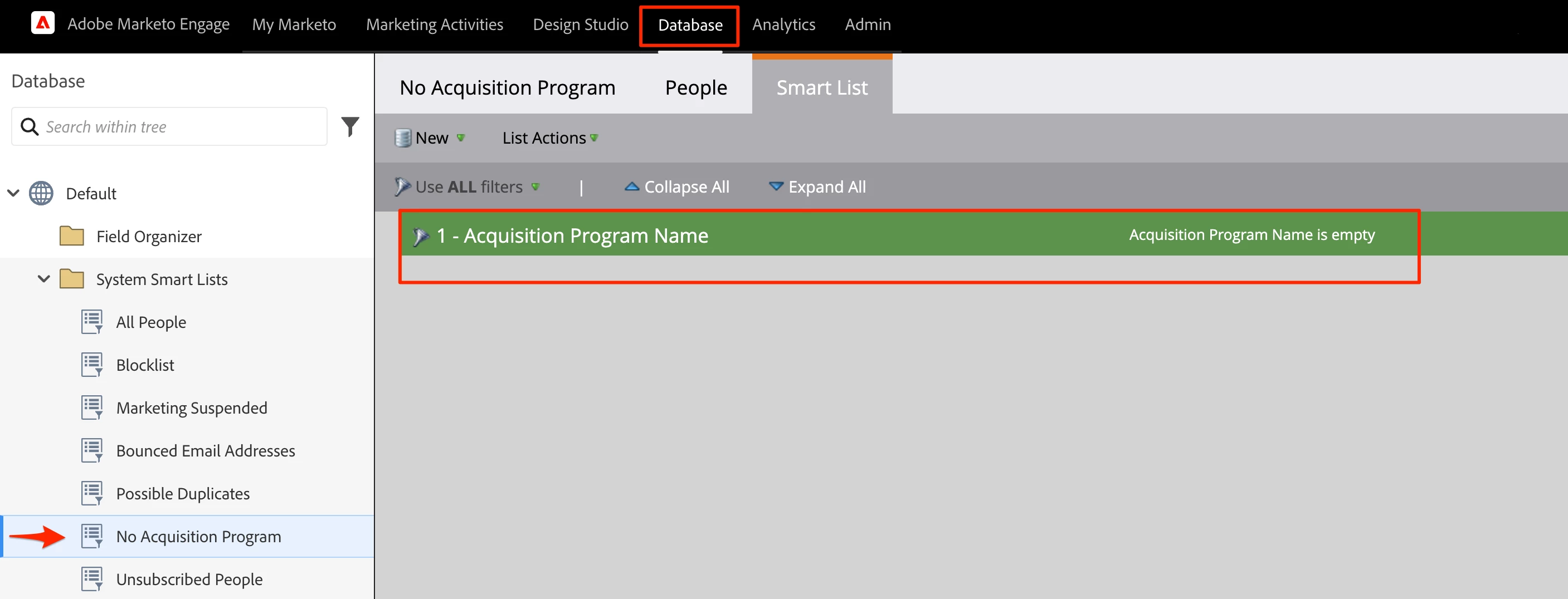To assess the volume, head over to the Database section of Marketo and run the System Smart List titled "No Acquisition Program". Double check that the filters on the smart list haven't been modified. The filters should look like this: