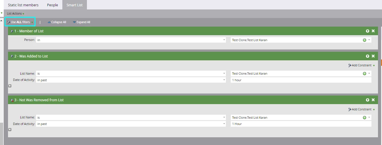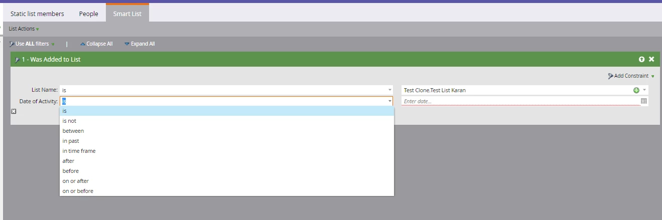 What I would like is another list, smart or static, that shows contacts who are 'stuck' on the static list. For example 'contacts who have remained on the static list for more than one hour'.