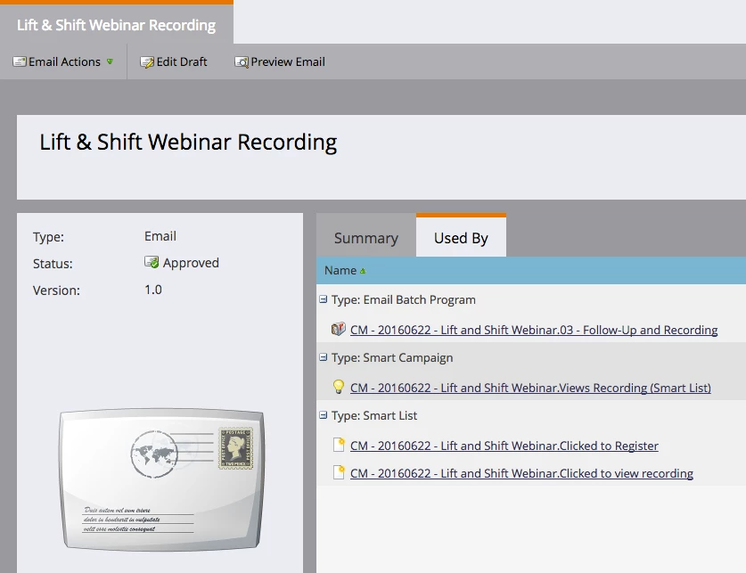 Piggybacking onto my (answered) question yesterday about cloning programs/smart lists....if I'm cloning a program for its smart list, how do I delete the email message if it's not the one I want to use? It appears that because the clone comes over as "approved" and "in use", I can't delete it or move it. I'm going to be using a different email (clone). Would be nice not to have two approved emails in here. Thanks.