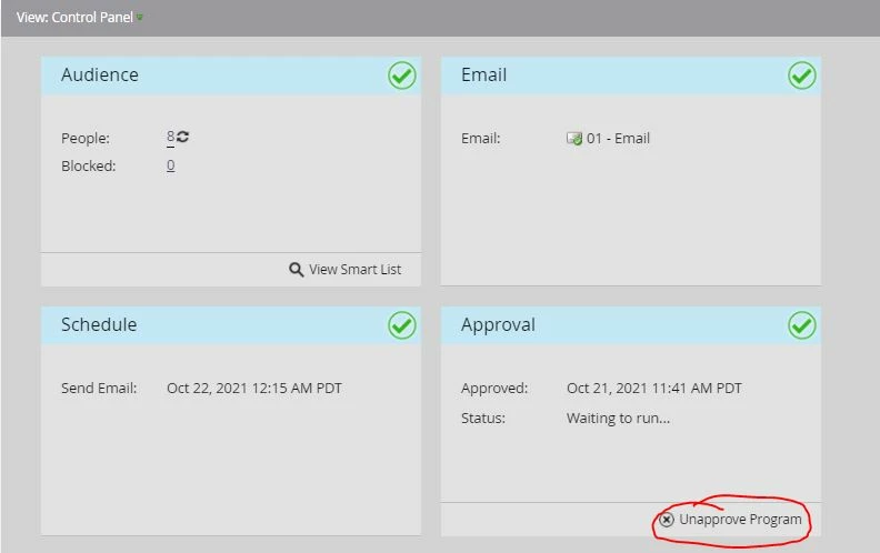 If the Approval section says "Approve program" instead of "unapprove program," your email send is not scheduled.