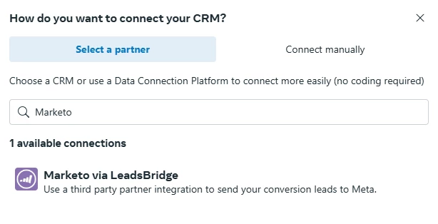 When searching for Marketo within the partner section of Facebook's setup process, it directs you to LeadsBridge. We also saw that Zapier is something that we could potentially use. (Both Shown Below)