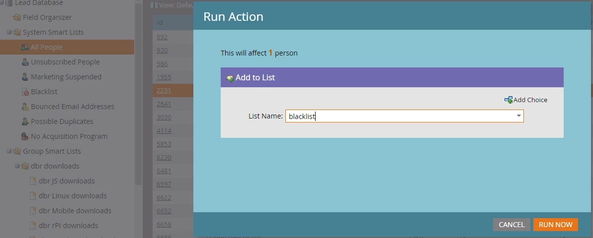I tried to add a person to a blacklist using the following menu. And it did not work. It was skipped. Did I set the list name wrong?