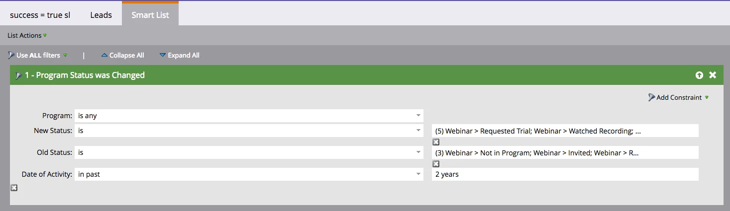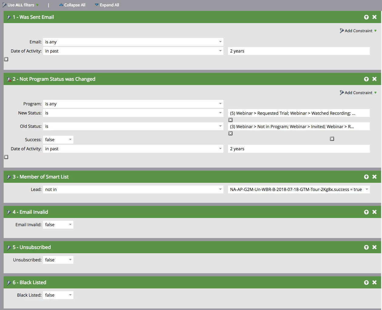 Then in your target list you'll just use "is not" the above smart list. I'm also using the "Not Program Status was Changed" with the same filters I used in the Positive smart list. I've added some other exclusions like email invalid... as a reminder to clean up the list.