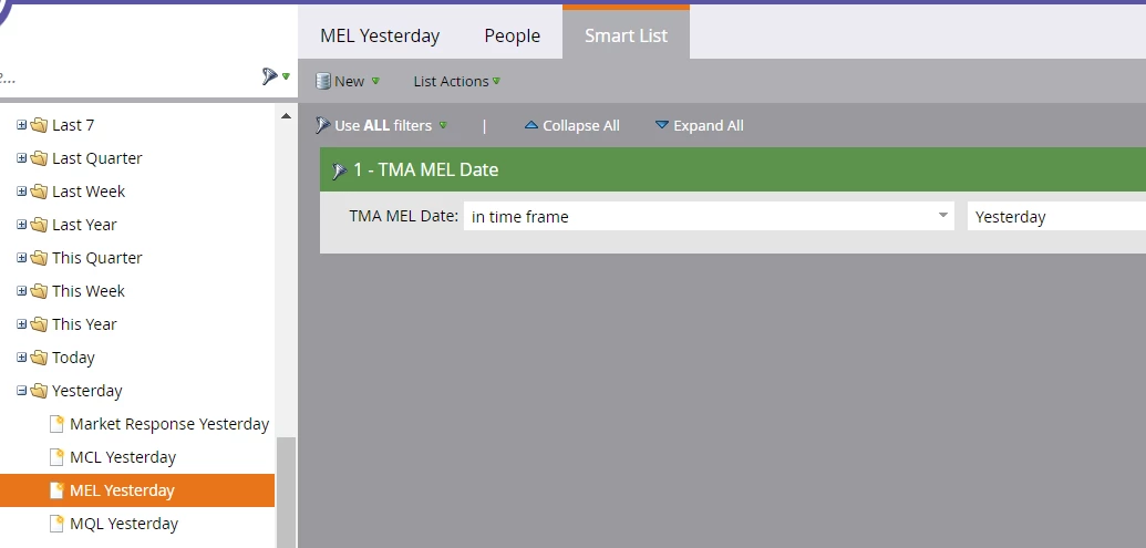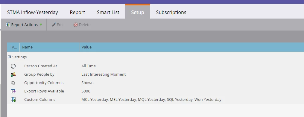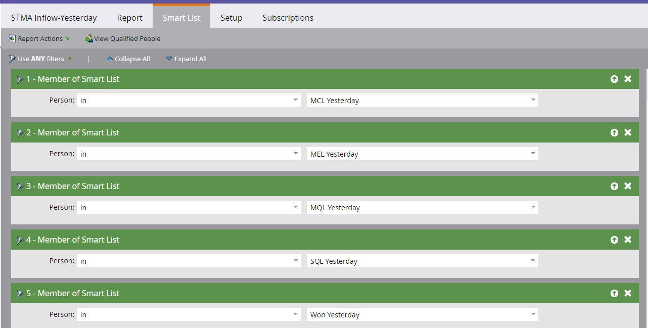EDIT: Note that this gives you a report for people who entered the stage in that timeframe, not people who were in the stage (e.g. John Doe becomes SQL 2 days ago and is still an SQL. He will not show up in the SQL Yesterday smart list). If you're looking for a snapshot view, use the Success Path Analyzer and click on "Balance." You can adjust the time frame in the Setup tab.