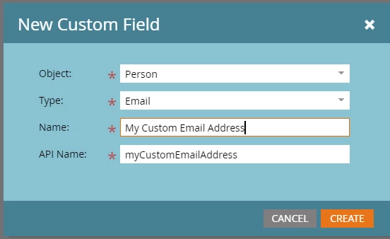 Create a custom email address field on person object using the new custom field creation dialog -