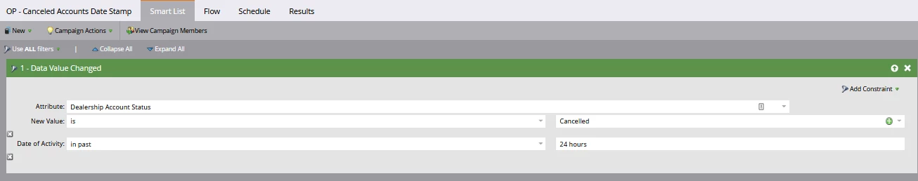 The smart campaign batch is tricky because Account Status = Canceled provides the total of Canceled Accounts which will include all of those within the past 30 days. I should also note that it is not as easy as using "Data Value Changed" filter as our custom CRM indicates 28,958 Canceled Accounts but only 2000 as a results of "Data Value Changed" so that data is not usable for this.