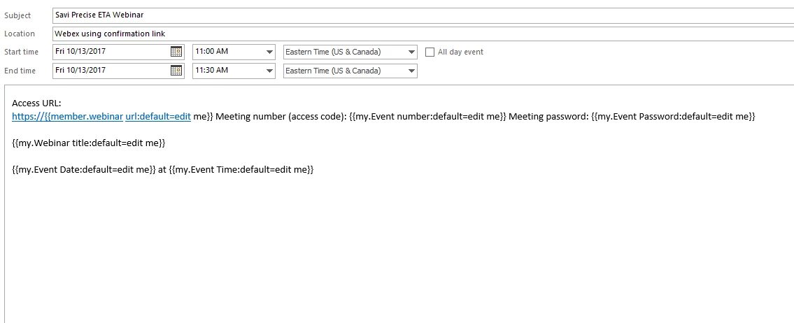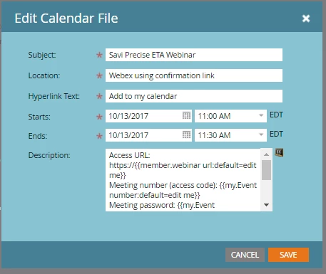 I am doing a Webex webinar for the first time and want to include an Add to Calendar Link on the registration confirmation email. The tokens are showing as text in the ICS. calendar body See below
