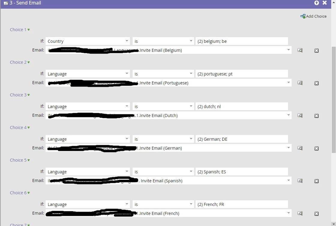 It was all clear and simple until I had to work on the email for Belgium. I included the Belgium email in an If choice like "If Country is Belgium sent Belgium email;"