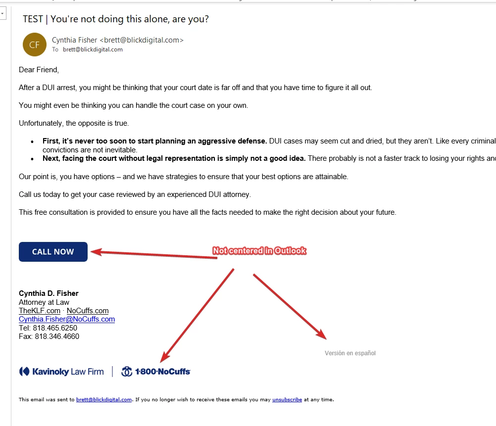 It looks great in Gmail, but in Outlook the images are not centered and the email width seems off. Are there basic rules css or html attributes we can add to this email to fix it in Outlook?