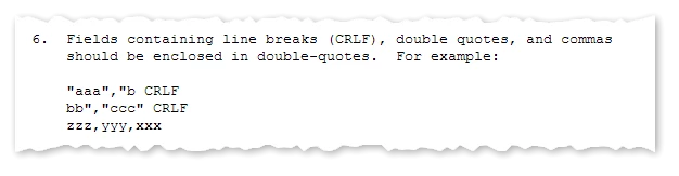 If you don’t know, RFC 4180 is the closest we’ve got to an official standard for what a CSV, well, is. The RFC is Informational, so it’s not binding like a true Standard. But it covers a bunch of advanced cases very well, and if you’re writing a thing you call a “CSV parser,” you try to hit as many of its points as possible.