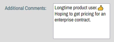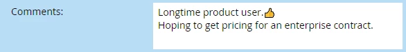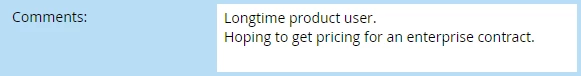 "comments__c" : "Longtime product user.\ud83d\udc4d\nHoping to get pricing for an enterprise contract."