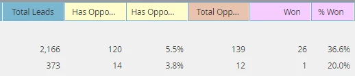 1. So my first question - what is the difference between the "has opportunity" and "total opportunity"? My initial assumption was that "has opportunity" is the number of leads/contacts that were added to opportunity, and "total opps" is the number of actual opportunities leads were added to (one opportunity can have multiple contacts added to it, hence the discrepancy in numbers), but how is it possible then that the number of total opportunities in the first row is larger than the number of leads that have opportunity?