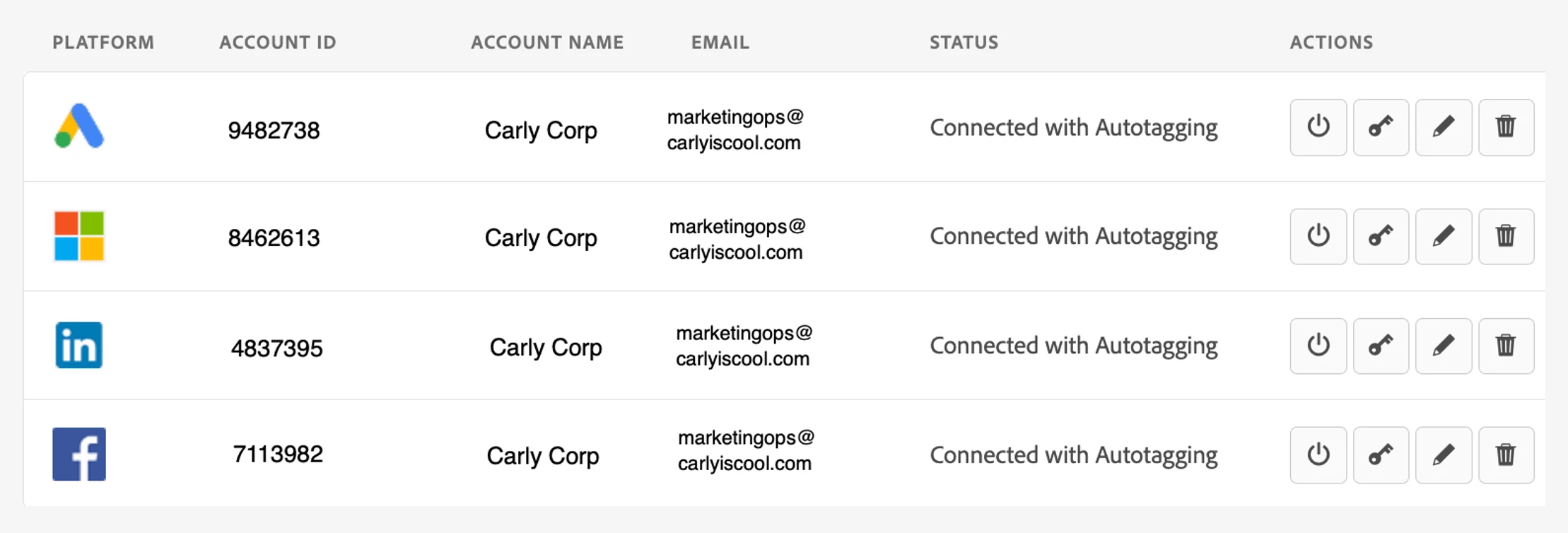 When auditing this area, you should be confirming that all platforms are connected and that auto-tagging has been properly enabled. For more information on auto-tagging, be sure to read this article: Why Marketo Measure's Auto-tagging is important.