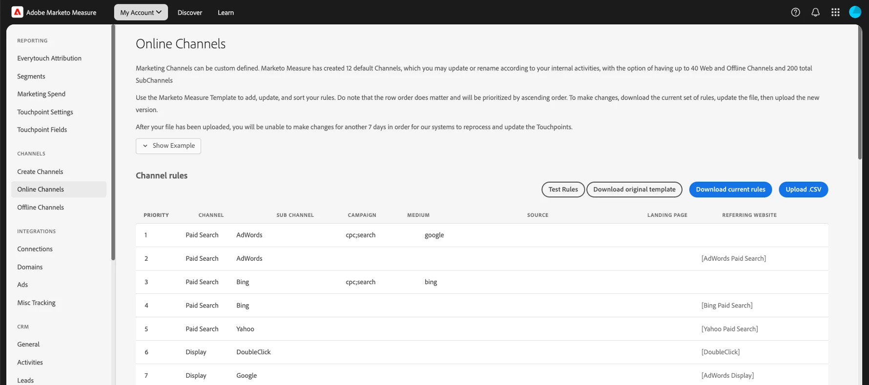 When it comes to your online (or digital) touchpoints, Marketo Measure uses an Online Rule Sheet that is uploaded to your instance. This is a .csv file containing multiple rows – each representing a rule that defines how digital touchpoints are categorized into specific Online Channels and Subchannels.
