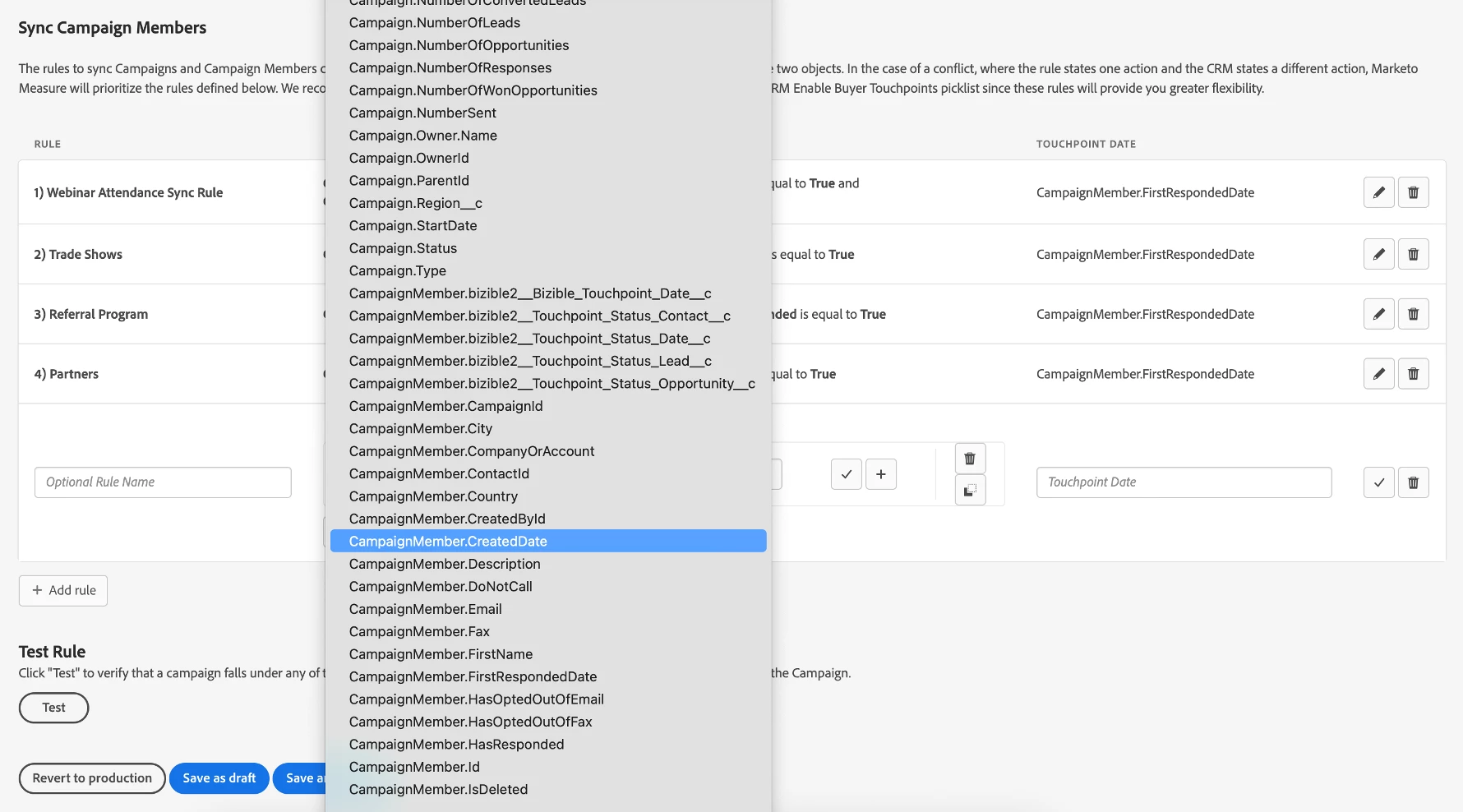 While there are multiple ways to track offline (non-digital) touchpoints, utilizing CRM Campaign Sync Rules is the most common, so I always recommend customers start here. This feature allows you to create a rule using Campaign and Campaign Member fields from your CRM.