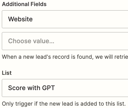 The “New Lead” event is used in the Marketo app in Zapier to trigger our classification workflow. As shown in the image below this zap will only trigger for leads added to the “Score with GPT” list in Marketo. We also have the opportunity here to specify any additional fields that we want to be available for the lead that triggers the zap. By default, only the lead’s email, first name, and last name will be pulled in for this trigger.
