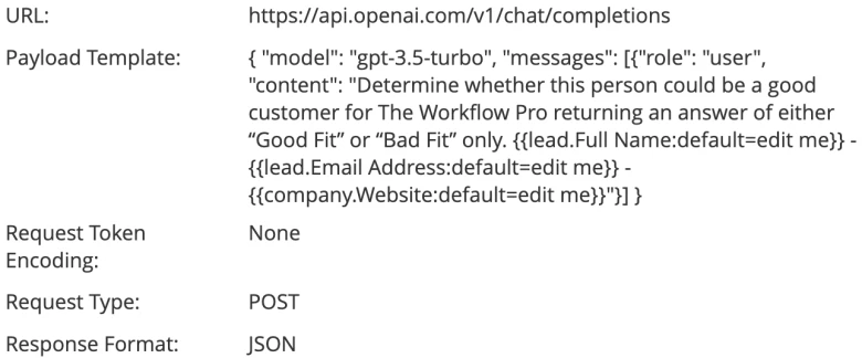 As shown in the image below we can use lead tokens within the payload template to send information about a Marketo person to ChatGPT for evaluation. Contrary to making ChatGPT requests in Zapier, as shown in the section above, we do not have an easy way in Marketo of parsing the response returned from ChatGPT so we have to tell ChatGPT to give us very specific answers that we can map directly to Marketo fields.