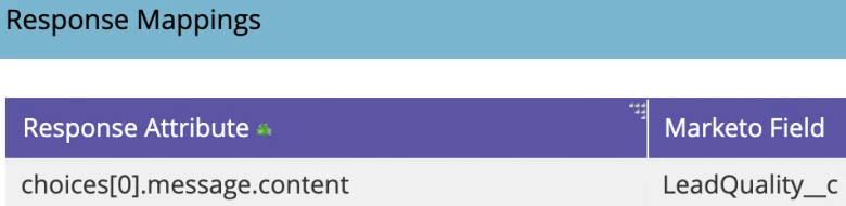 The final part of the webhook configuration is to map the response from ChatGPT to a field in Marketo so that the value can be stored. Looking at the response structure from the ChatGPT request we can see that in order to reference the message content we need to access the first index (index 0 since counting starts at 0 instead of 1) of the choices array parameter, then the message parameter, and finally the content parameter.
