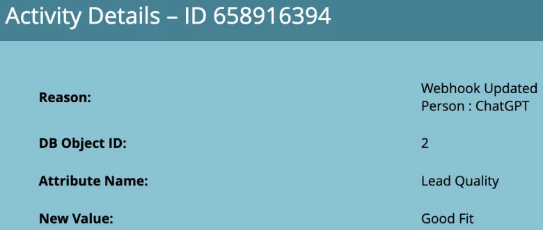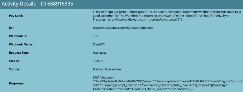When you go to the activity log of a lead you will be able to click into the “Call Webhook” action to see the detail of the API request sent from Marketo to ChatGPT as well as the response returned from ChatGPT. Similarly, you can click into the “Change Data Value” activity to see that the reason the person’s field value was updated was because of the ChatGPT webhook.
