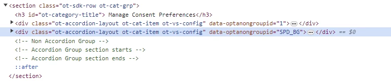 You can get group IDs from the popup HTML. See where group "1" is the Strictly Necessary Cookies setting, while group "SPD_BG" corresponds to Sale of Personal Data?