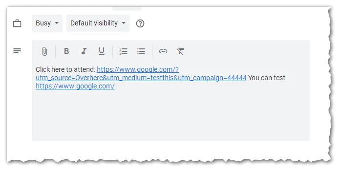 http://ics.agical.io/beta/alt_sep/?subject=This is a test: Again;description=Click here to attend: https://www.google.com/?utm_source=Overhere&utm_medium=testthis&utm_campaign=44444  You can test https://www.google.com/;dtstart=2019-09-05T15:00:00z;dtend=2019-09-05T16:00:00z;organizer=@this.com;location=Here;format=gcal;preencoded=true