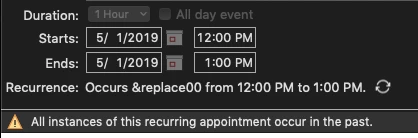 1. I'm having issues using the recur with Outlook. It works fine when I open the file into my iCal but when I open into Outlook it says all meetings occur in the past.