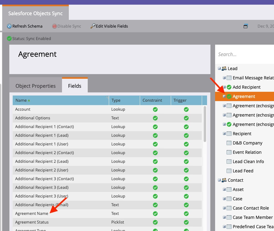 I'm using the Salesforce-Marketo sync and I have a custom Salesforce object called "Agreement" being synced. The "Agreement" object is related to Leads, and it has several fields defined in it (see screenshot).
