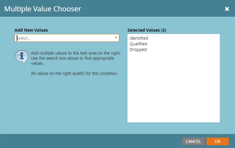 - At the popup, click the drop down and add all value. The Value will be added to the right