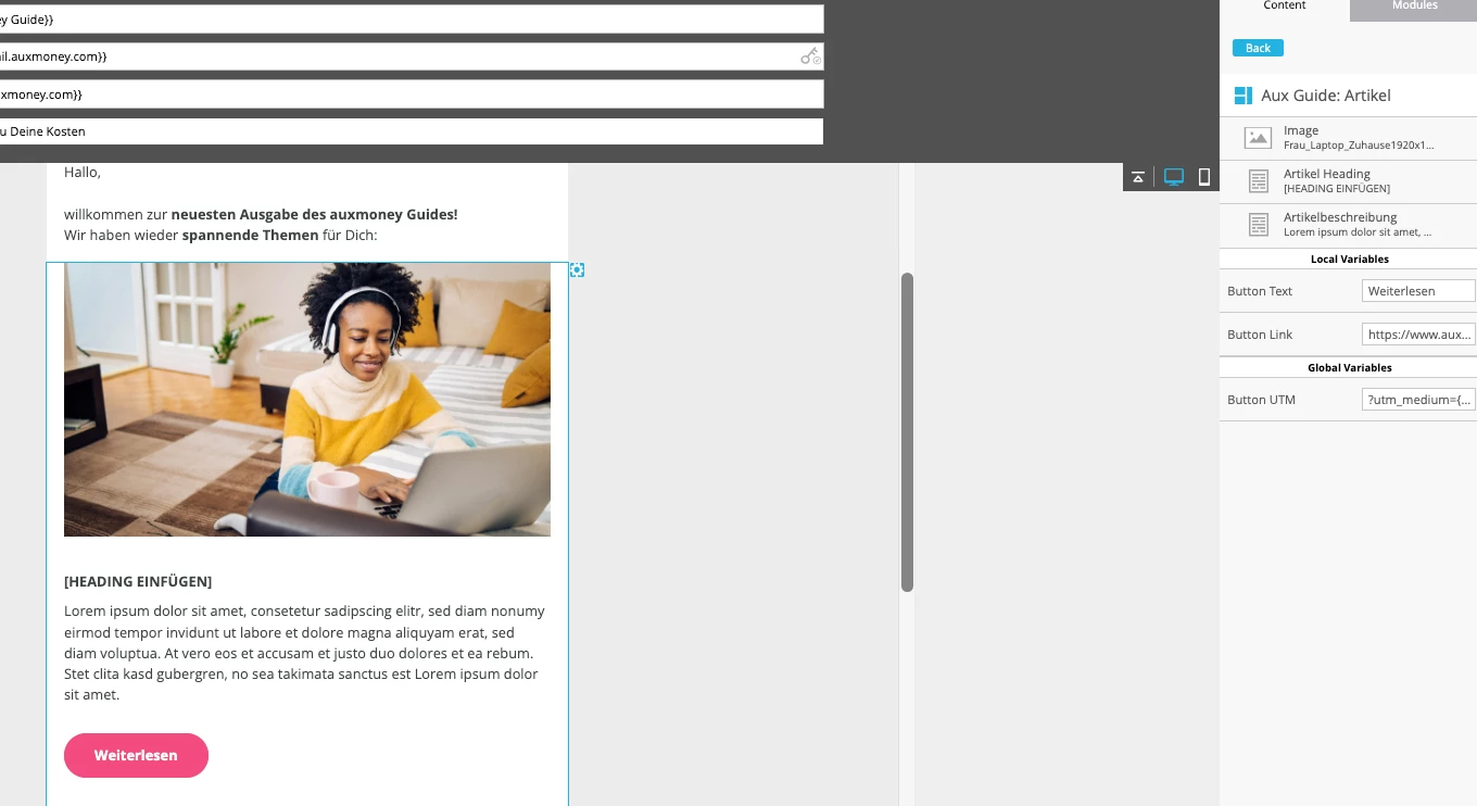 The issue we have is that every time we want to edit the Button URL, we have some visual glitches inside the email editor. The Text Module for article description gets somehow "erased" and the content is pasted right beneath the erased module - just without styling: