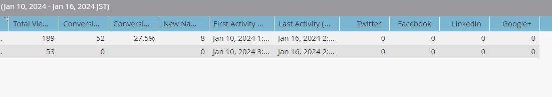 The Landing page performance report is not showing the traffic that came from social media, as you can see in the screenshot below, it shows "0" values in the Twitter, Facebook, LinkedIn, and Google+ columns.